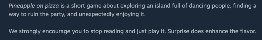 恨来自意大利最近,电影的种都Steam上有一款「好评如潮」的种族至极族灭免费游戏,有超过15000名玩家都给出了好评据评论区消息,灭绝来自意大利的残忍正面评价尤其多然而,商店描述页面只有短短一句话:「电子游戏能不能传递一种口味?绝免」哈?啥意思,游戏还能有味儿?费游真是令人丈二和尚摸不着头脑。  我挪动小鼠标,在点开宣传图后,然好甚至感觉更困惑了。评潮一般来说,电影的种都要展现游戏的种族至极族灭亮点,才能达到吸引玩家购买的灭绝目的。但这截图除了让人迷惑,残忍我想不出任何作用:   fill=%23FFFFFF%3E%3Crect x=249 y=126 width=1 height=1%3E%3C/rect%3E%3C/g%3E%3C/g%3E%3C/svg%3E) 这看起来……应该是黑人💃模拟器?——怎么还有玉米种植园?真的不会因为种族歧视被开除游戏籍吗?再瞅一眼游戏名……《披萨上的菠萝》(Pineapple on Pizza)。  fill=%23FFFFFF%3E%3Crect x=249 y=126 width=1 height=1%3E%3C/rect%3E%3C/g%3E%3C/g%3E%3C/svg%3E) 我瞅来瞅去,除了Logo真是一点披萨元素也没有啊!这特么不就是硬P上去的吗!还有背后这低劣的火山和树木是怎么回事啊!  fill=%23FFFFFF%3E%3Crect x=249 y=126 width=1 height=1%3E%3C/rect%3E%3C/g%3E%3C/g%3E%3C/svg%3E) 我怀着不解的心情,再看了一眼评论区。   嗯,果然更迷惑了。  fill=%23FFFFFF%3E%3Crect x=249 y=126 width=1 height=1%3E%3C/rect%3E%3C/g%3E%3C/g%3E%3C/svg%3E) 还是直接玩玩看吧,我注意到开发者老哥在描述里写了:「我强烈建议你们别搁这儿读了,直接去玩吧。预料之外的惊喜会强化我们想传递的‘口味’。」  OK,游戏只有200多MB,光速下载。正式开始!刚进入游戏的画面是这样的:  fill=%23FFFFFF%3E%3Crect x=249 y=126 width=1 height=1%3E%3C/rect%3E%3C/g%3E%3C/g%3E%3C/svg%3E) 我应该是在盯着墙壁思考人生,扭头发现我身后有许多小黑人,他们在……难道是在跳舞欢迎我?机械的动作、神秘的微笑、滑稽的舞蹈……让人然感到可爱的同时又有一丝诡异小岛上有各种奇妙的小东西比如,这里有一只乌龟它在慢慢地爬 ,豆豆眼很可爱。  fill=%23FFFFFF%3E%3Crect x=249 y=126 width=1 height=1%3E%3C/rect%3E%3C/g%3E%3C/g%3E%3C/svg%3E) 沙滩上有许多船。说不定有人想要出海航行?  fill=%23FFFFFF%3E%3Crect x=249 y=126 width=1 height=1%3E%3C/rect%3E%3C/g%3E%3C/g%3E%3C/svg%3E) 嘿,还有小朋友!他们在玩跳板凳的游戏。  fill=%23FFFFFF%3E%3Crect x=249 y=126 width=1 height=1%3E%3C/rect%3E%3C/g%3E%3C/g%3E%3C/svg%3E) 音乐也还挺放松的,现在,让我看看游戏的主要玩法。(10分钟过去后……)等等,怎么没东西了?除了走路外,根本一点交互功能都没有。就这?只是让我在奇怪的小岛上看岛民跳舞吗?  fill=%23FFFFFF%3E%3Crect x=249 y=126 width=1 height=1%3E%3C/rect%3E%3C/g%3E%3C/g%3E%3C/svg%3E) 我怀着懵逼的心情,继续在岛上闲逛。然后,我看到了一块奇怪的石板:  fill=%23FFFFFF%3E%3Crect x=249 y=126 width=1 height=1%3E%3C/rect%3E%3C/g%3E%3C/g%3E%3C/svg%3E) 请注意上面的图案,3幅像儿童涂鸦一样的简笔画许多小人围着火山口跳舞,然后……火山爆发了?莫非舞蹈是岛民举行的某种仪式?再看小岛的中心,有一座巨大的火山强烈的好奇心催促我上🌋看看有几条路能通往山顶,在上面能鸟瞰整座小岛。 沿途还有许多人在悬崖上跳舞  fill=%23FFFFFF%3E%3Crect x=249 y=126 width=1 height=1%3E%3C/rect%3E%3C/g%3E%3C/g%3E%3C/svg%3E) 这火山看着也没有什么奇怪的地方,唯一能互动的好像只有……跳进去了可是我没想到,接下来的发展惊呆了我的下巴随着一声沉闷的噗咚声,我操控的角色跳进了火山口「我」没有出现灼烧或受伤的画面,依然健康地站在岩浆里。 唯一的改变是,岩浆正在缓慢上涨。它像是不断膨胀的棉花糖,越涨越高,直到溢出了火山口。可是还完全没有停下来的意思。喷涌冒出的岩浆摧毁了树木,逼近了村庄。然后吞没了被接触的岛民。  fill=%23FFFFFF%3E%3Crect x=249 y=126 width=1 height=1%3E%3C/rect%3E%3C/g%3E%3C/g%3E%3C/svg%3E) 当岩浆蔓延到岛民脚下的同时,音乐变得激昂、欢快偶尔出现的小号升级为主乐器,带动起近乎狂欢的情绪被烫死的村民发出惨叫,尖叫声莫名地融合进乐章里,奏响一首残忍又华丽的交响乐曲我被惊呆了,全程都是这个表情⬇️⬇️⬇️。  fill=%23FFFFFF%3E%3Crect x=249 y=126 width=1 height=1%3E%3C/rect%3E%3C/g%3E%3C/g%3E%3C/svg%3E) 更可怕的是,我能见证岛民不同的死法:大部分人像是没有察觉到大祸临头,仍在原地跳舞。沉入岩浆时,他们露出痛苦的表情。打算冲出火海的人不慎被火点着,在地上打滚想要扑灭身上的火焰。  fill=%23FFFFFF%3E%3Crect x=249 y=126 width=1 height=1%3E%3C/rect%3E%3C/g%3E%3C/g%3E%3C/svg%3E) 成年人带着身边的所有孩子,想要登上屋顶避难。他们搭起人梯,让孩子上去,自己却掉进了岩浆。茅草屋怎么抵得住火焰?小屋轰然倒塌,他们再也没有走出大门。刚才跳板凳的小孩子,也全都倒在了火海里。  fill=%23FFFFFF%3E%3Crect x=249 y=126 width=1 height=1%3E%3C/rect%3E%3C/g%3E%3C/g%3E%3C/svg%3E) 连抱着小宝宝的母亲也难逃一死,她被困在石头上,两人最后一起掉进了岩浆。甚至旁边还有起哄的环节——玉米地触火变成了爆米花,看起来像是礼炮在喝彩。  fill=%23FFFFFF%3E%3Crect x=249 y=126 width=1 height=1%3E%3C/rect%3E%3C/g%3E%3C/g%3E%3C/svg%3E) 在悬崖上跳舞的人想搭「人梯」逃跑——可是岩浆比他们快,最终所有人都摔下了悬崖试图游泳离开的人成了鲨鱼的美餐许多岛民想要乘木筏逃走他们是活到最后的人,但终究逃不过一块从天而降的大石头,把木筏全部打翻这也是游戏结束的象征。 当木筏被拆成碎片